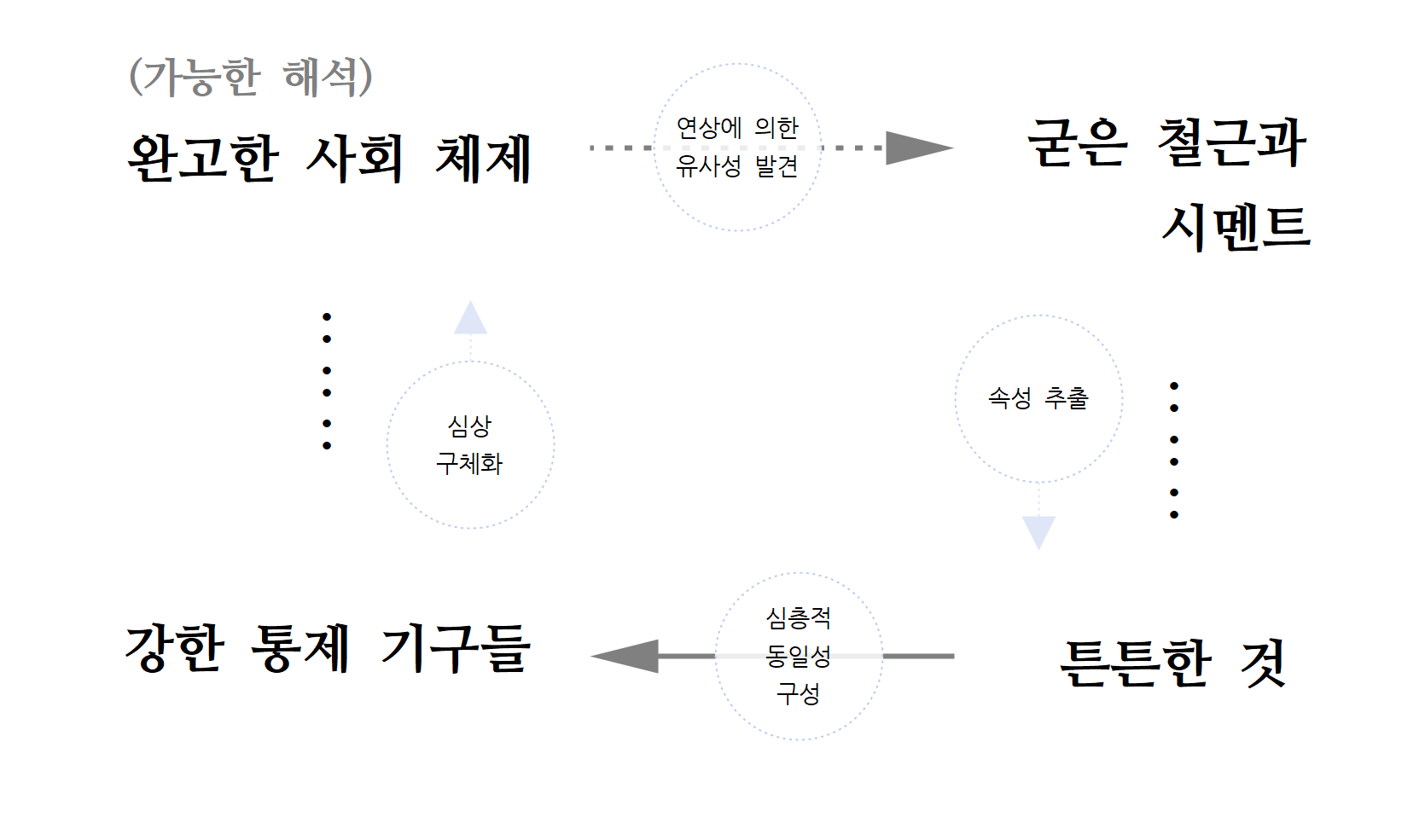 2. '굳은 철근과 시멘트'에서 의 또 다른 속성들을 떠올림.